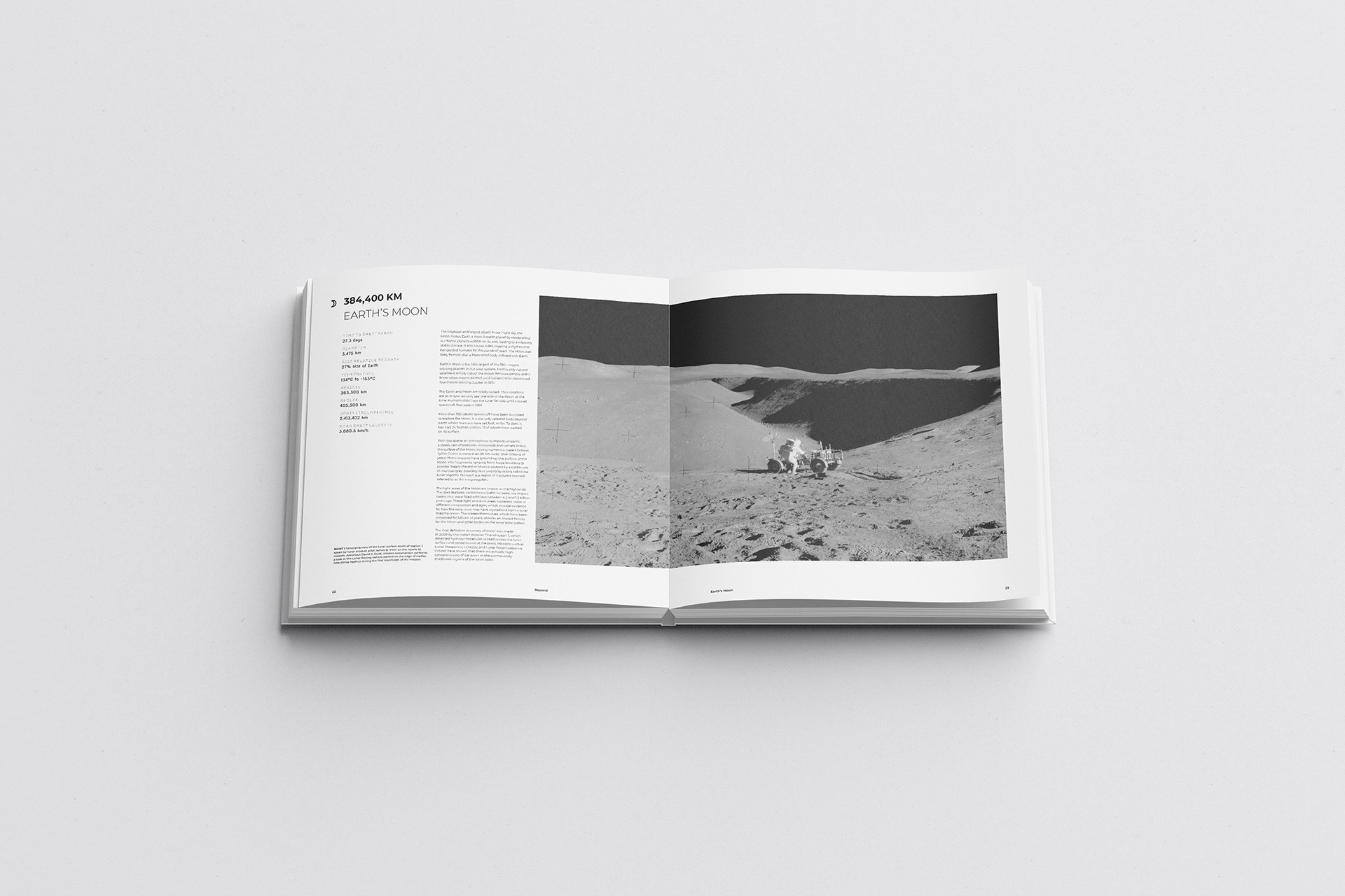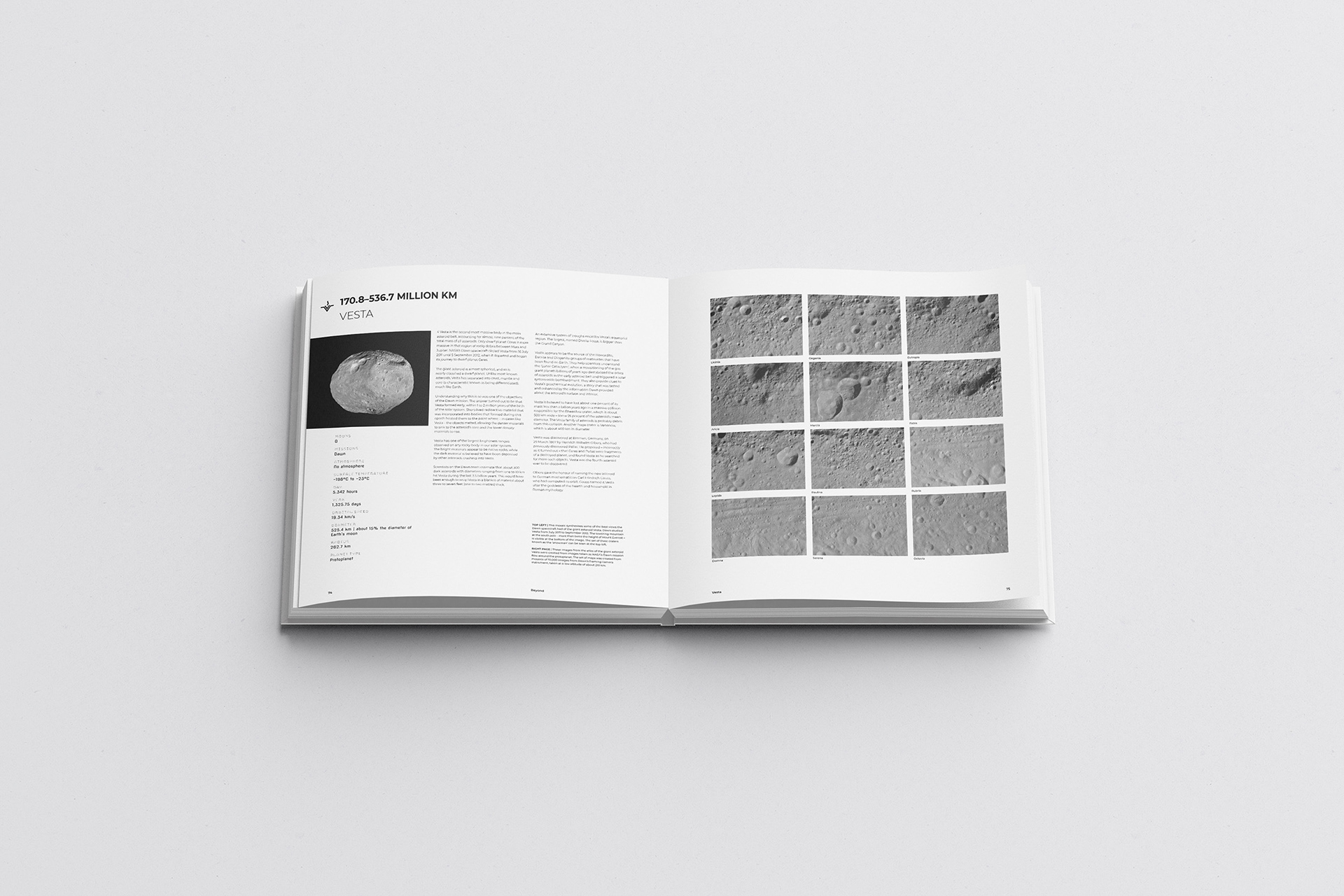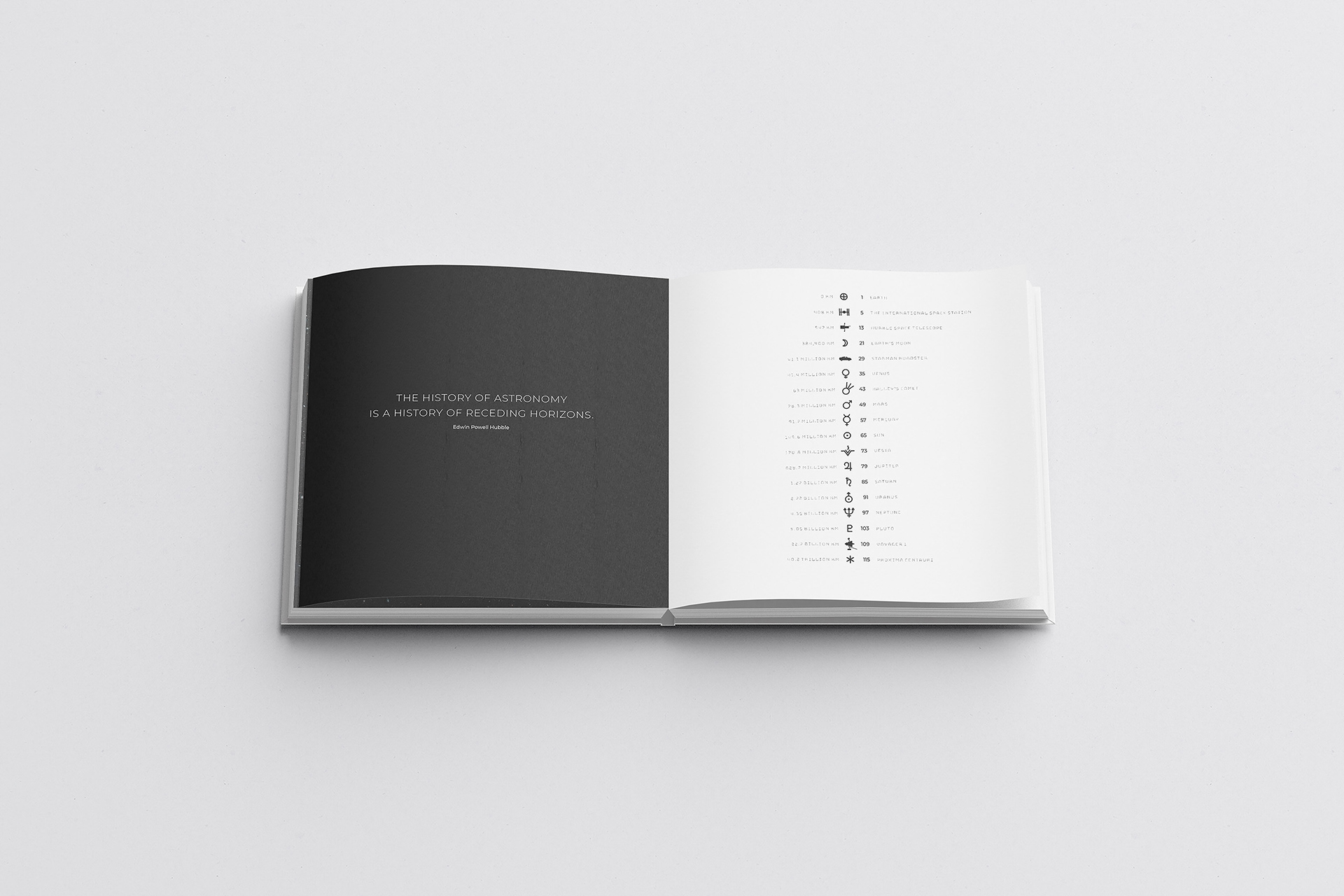 To link the hybrid publication to the digital landscape and further set it apart from similar books, which employ classic serif typography, I opted for a clean, modern sans serif and supplementary ‘space’ typefaces. In the ebook, the space-themed ones are prominent, giving a playful feel to complement the ebook’s interactive and educational style. In the POD book, these are reserved for illustrations and the short factsheet introducing each object.