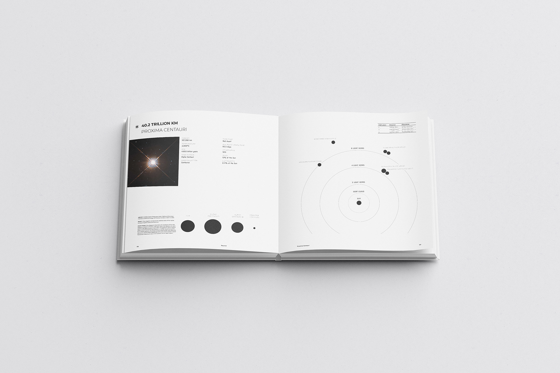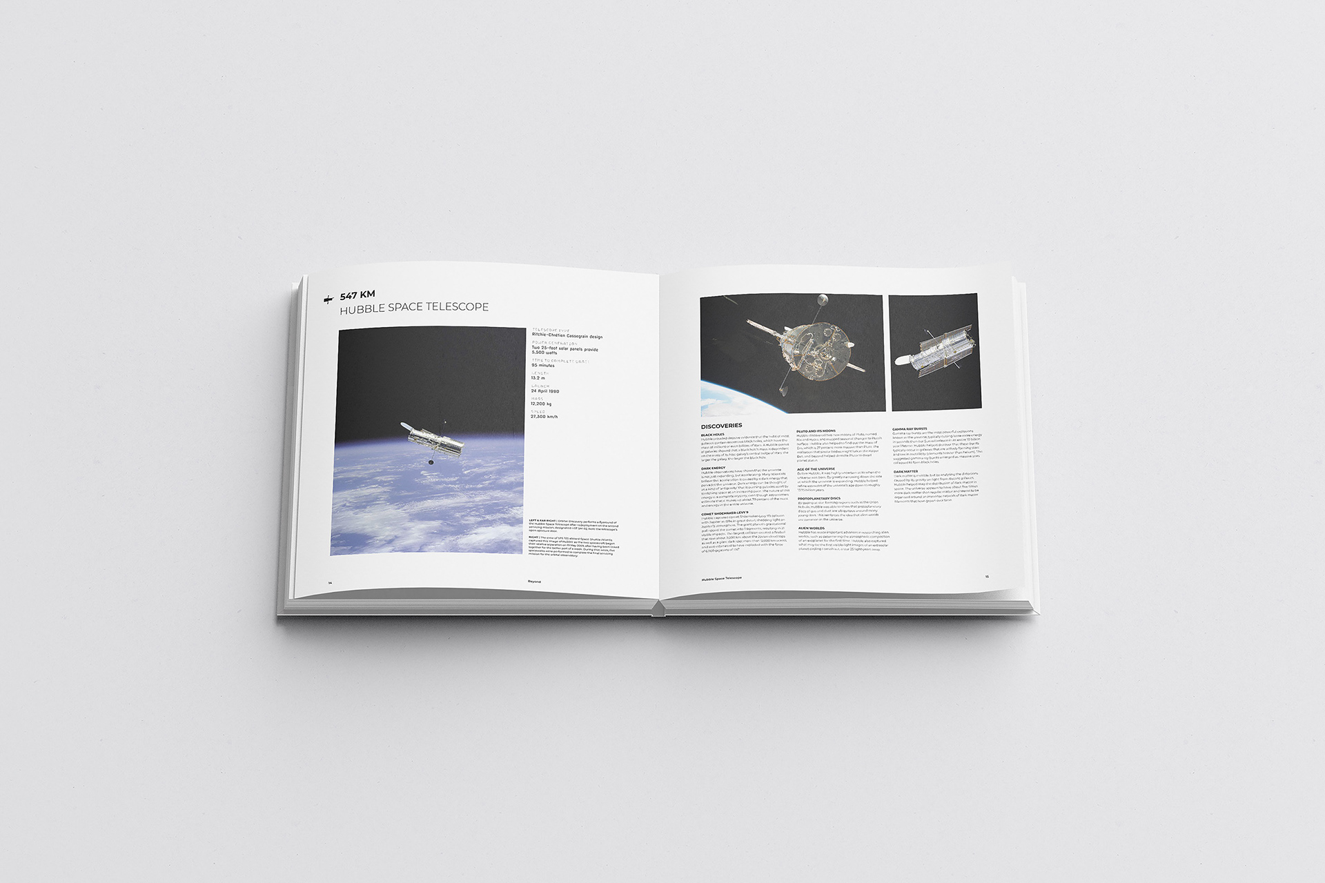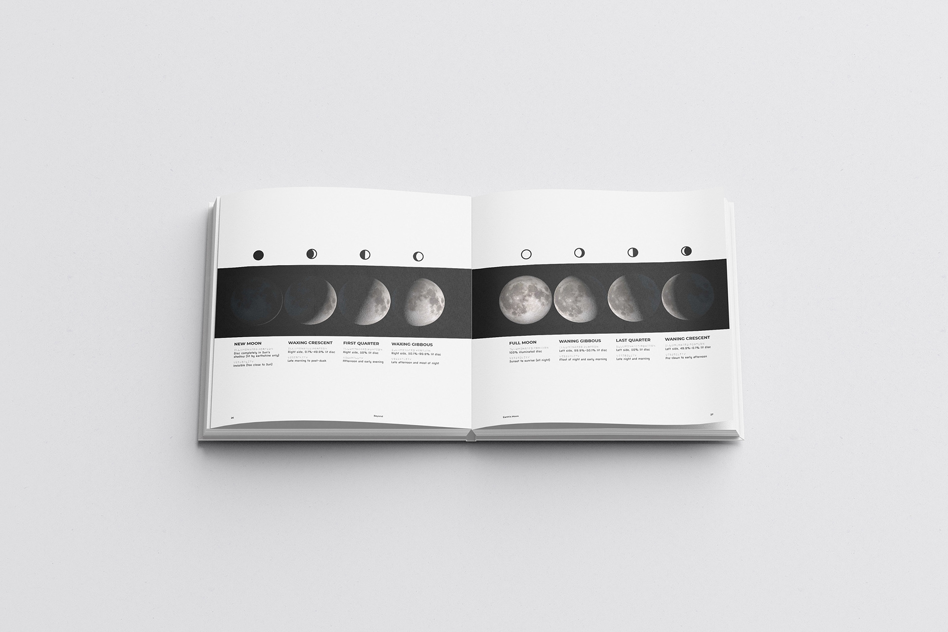 To link the hybrid publication to the digital landscape and further set it apart from similar books, which employ classic serif typography, I opted for a clean, modern sans serif and supplementary ‘space’ typefaces. In the ebook, the space-themed ones are prominent, giving a playful feel to complement the ebook’s interactive and educational style. In the POD book, these are reserved for illustrations and the short factsheet introducing each object.