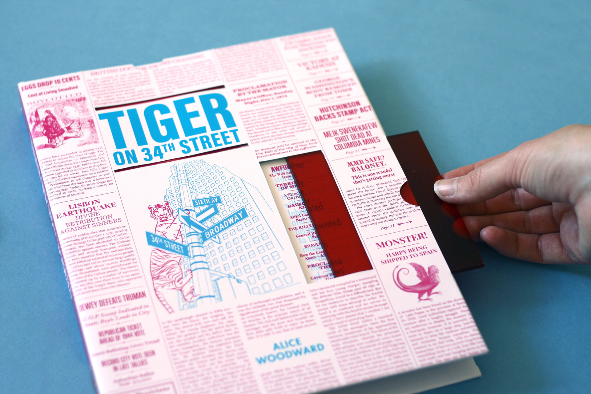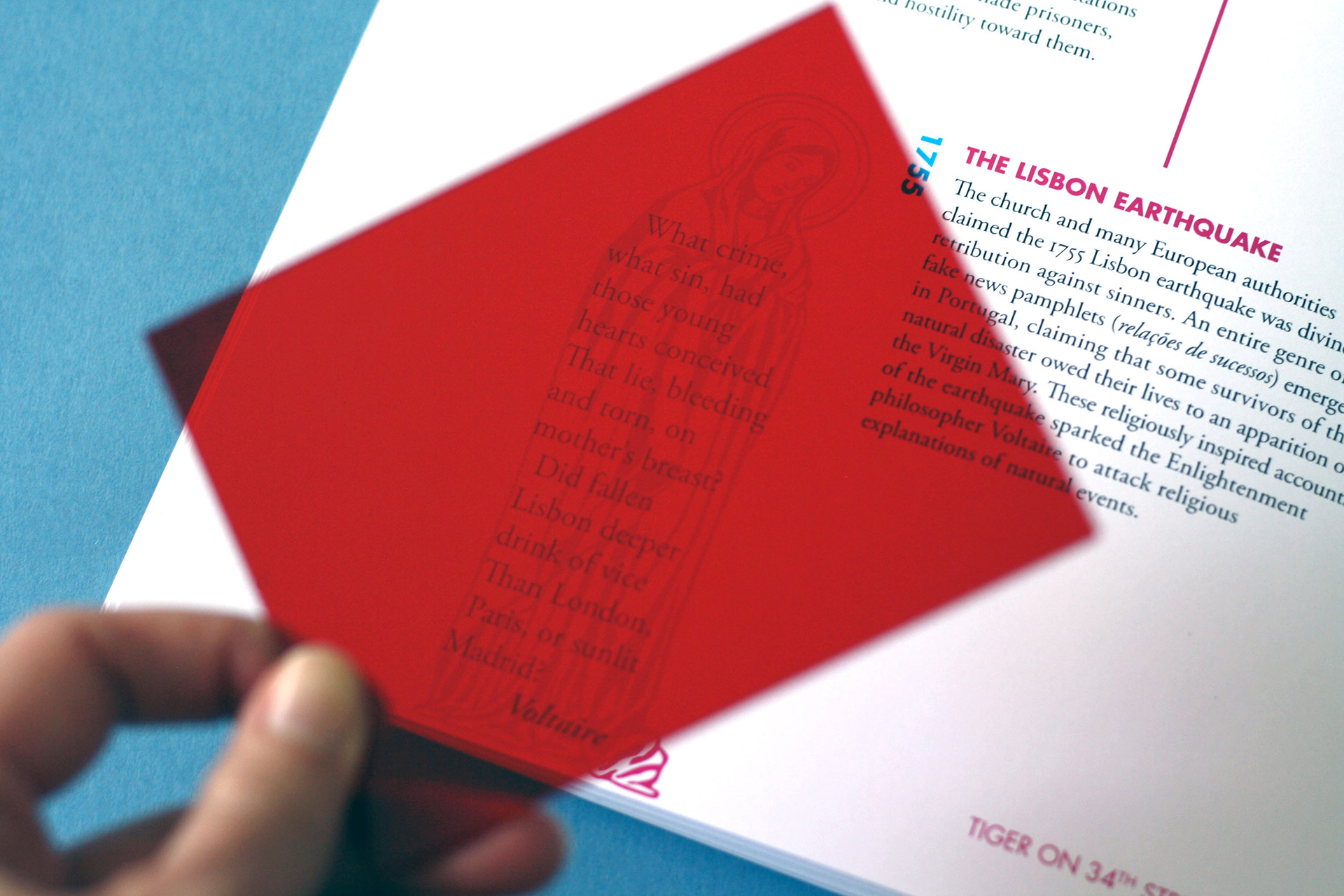 The book uses tools – a mirror and red colour filter, both acrylic – which are removable from the cover and used to decode the contents of the book. This tactile approach effectively engages the reader in a novel way, reimagining ‘reading’ as an interactive activity.