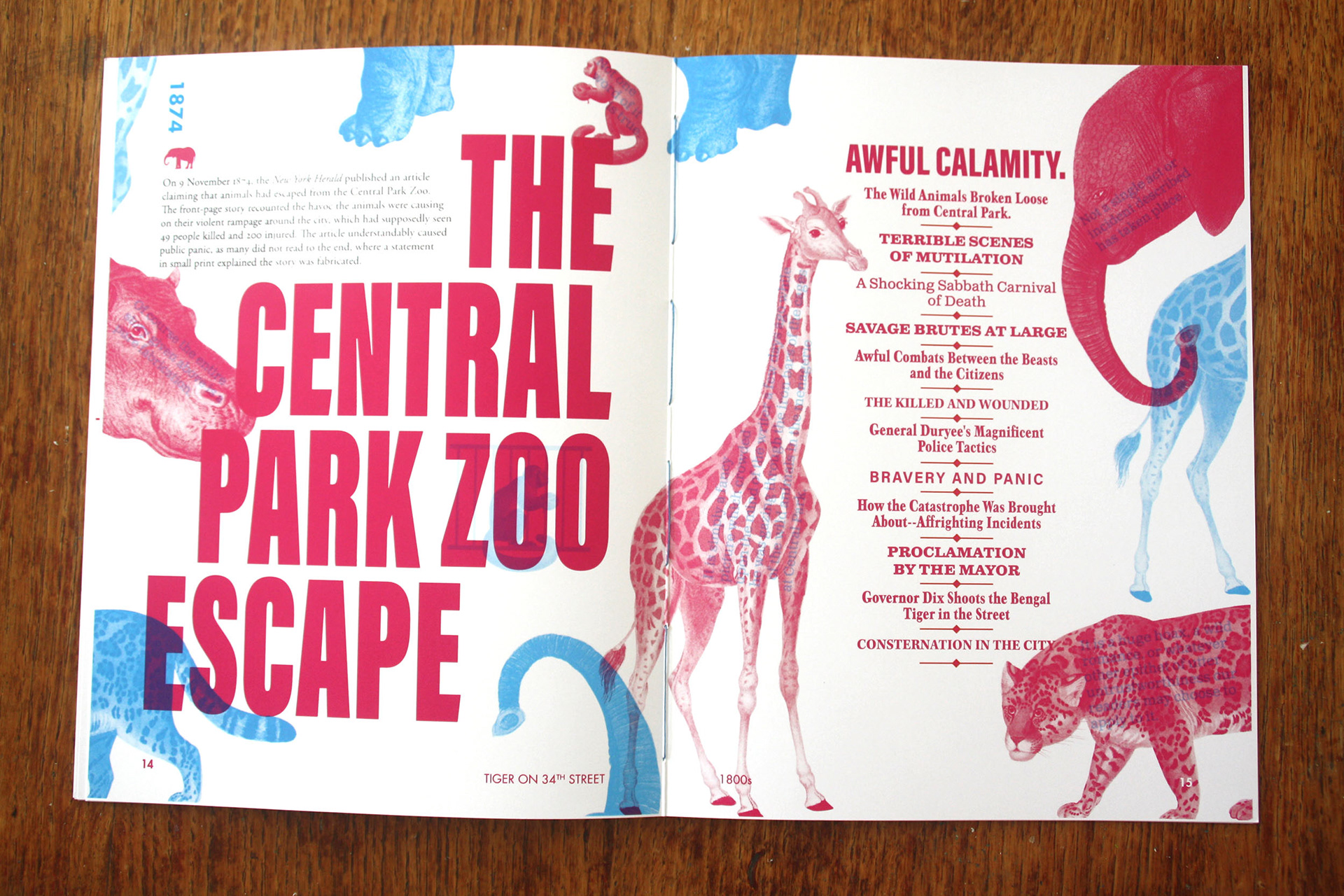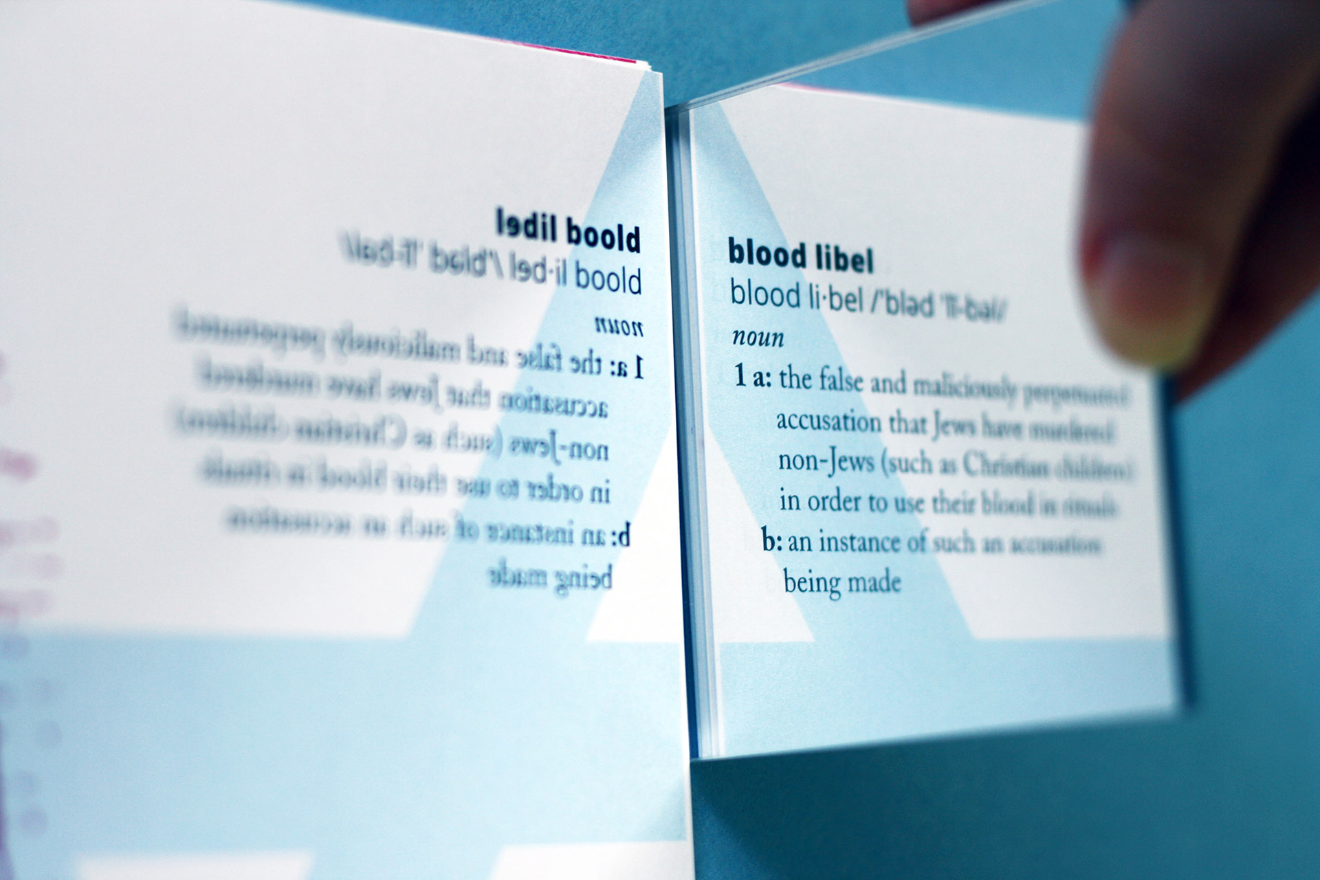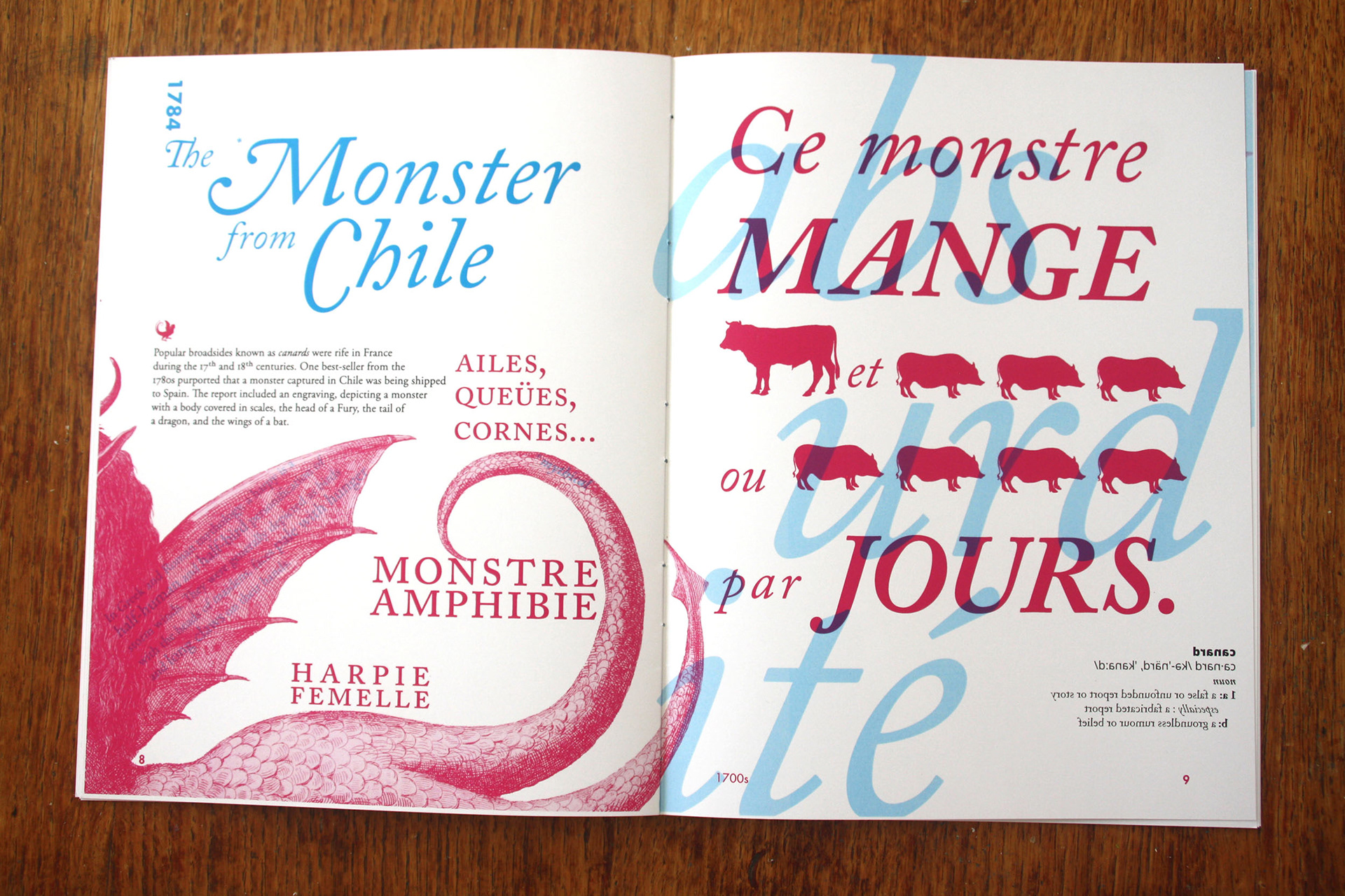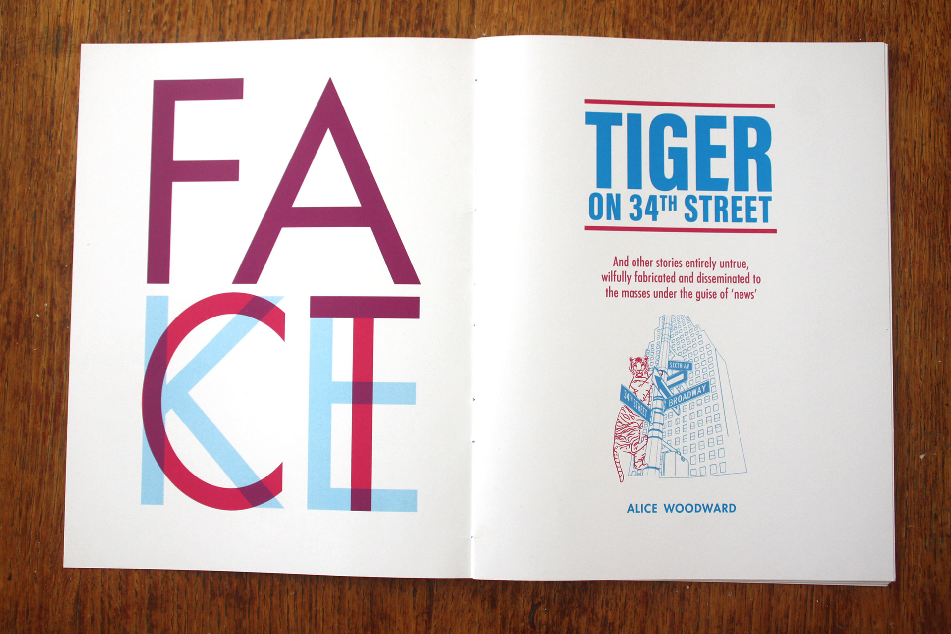 I used two-colour overprinting as a means of interrogating versions of ‘truth’. Magenta is used to print elements that constitute ‘fake news’, such as hoax news articles and illustrations of mythical creatures, while the ‘truth’ is printed in cyan. Viewed by the naked eye, the magenta imagery dominates, but seen through a red filter, the ‘truth’ is visible as the cyan elements below become almost black, with the filter acting as a metaphor for critical thinking. The mirror must be held against the edge of the page to read reverse-printed dictionary definitions explaining concepts and archaic terms.