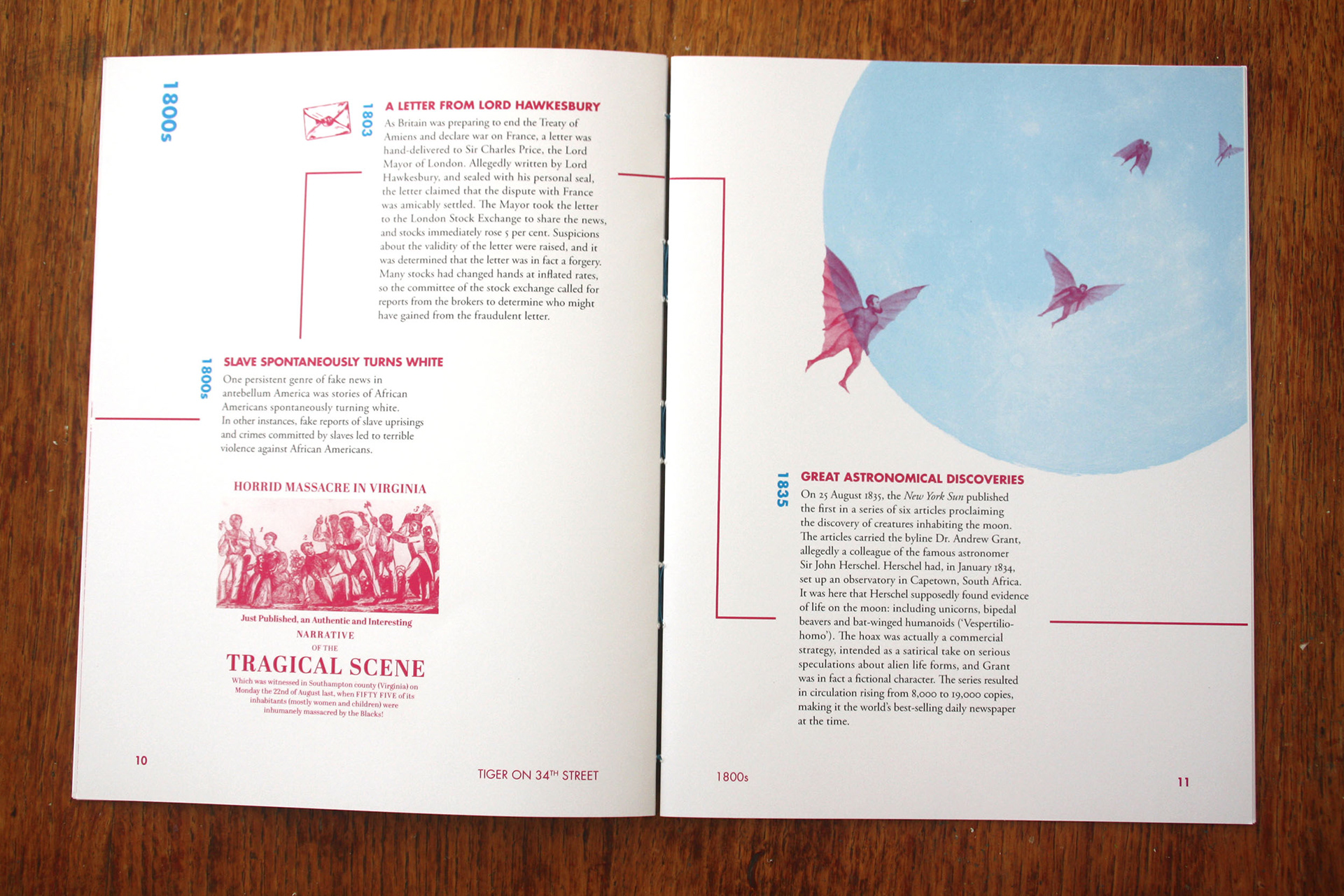 The narrative that pulls the disparate stories together is chronological, with the book forming a journey through the history of misinformation, with examples from the 13th century BC to the present. Feature spreads using expressive and associative typography and lots of imagery are balanced out by simpler ‘timeline’ spreads, presenting snippets of stories with small illustrations and providing an element of continuity.